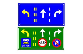 איך לזכור: התמרורים הגדולים האלה, שמוצבים בדרך כלל מעל הכביש לפני צומת או מחלף, הם כמו מפה קטנה שמסבירה מה התפקיד של כל נתיב. תסתכל טוב מה כל חץ מראה ואיזה סמלים נוספים יש בכל נתיב. המטרה שלהם היא לעזור לך לבחור את הנתיב הנכון מראש. 🗺️