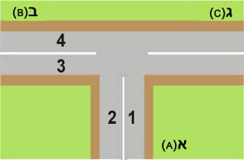 הצומת שלפניך מתומרר בדיוק כבציור. מהו האופן הנכון לפנות מרחוב א' (A) לרחוב ב' (B)?